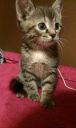ma około 3-4 miesiące (samica), koloru szarego, pręgowana (typowy burasek, dachowiec)