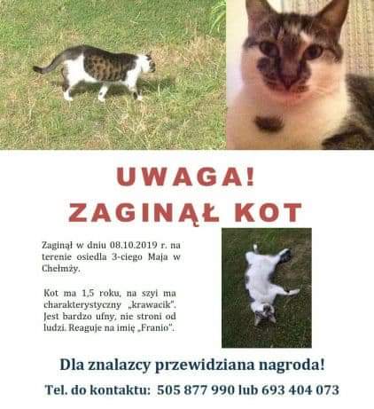 W dniu 8.10.2019 r. na terenie osiedla 3-ciego Maja w Chełmży zaginął kot. Reaguje na imię "Franio", jest bardzo ufny i nie stroni od ludzi. Ma trochę krótszy ogonek i charakterystyczny krawacik pod szyją. Proszę o pomoc w odnalezieniu, tel. kontaktowy 504877990 lub 693404073